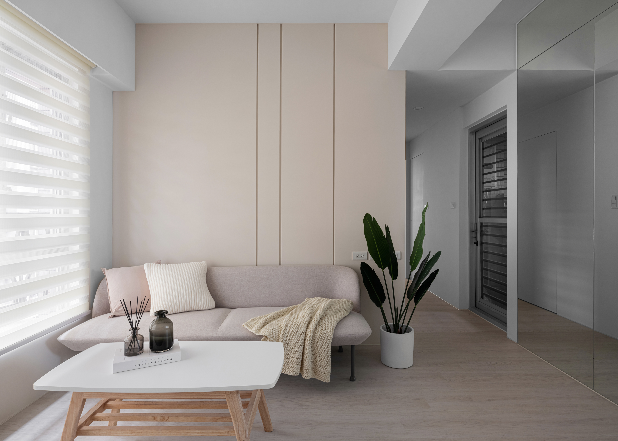 白色立面與淺色地坪讓光線可以均勻漫散,視覺自然被「拉遠」,小坪數也不顯得擁擠。